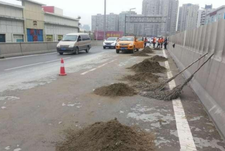 2019年5月5日早上,河南省郑州交警三大队接到群众报警陇海高架二层由东向西方向一马路段发生严重堵车,民警第一时间赶到现场发现,由于陇海高架二层路面有大量沙土造成道路的严重拥堵。