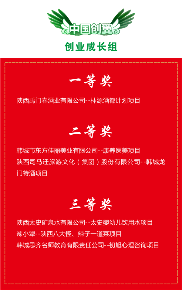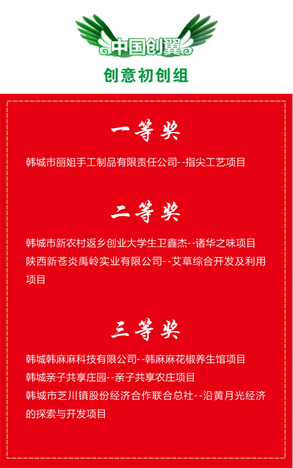 经过紧张有序的巅峰对决,最终,陕西禹门春酒业有限公司--林源酒都计划项目和韩城市丽姐手工制品有限责任公司--指尖工艺项目从12个优秀参赛项目中脱颖而出,分别荣获第五届“中国创翼”创业创新大赛韩城选拔赛暨韩城市第二届乡村振兴创业创新大赛总决赛创业成长组和创意初创组的一等奖。同时将推荐优秀创业项目参加省级创业大赛进行宣传推广,展示交流,对接优质资源,提升创业项目和创业者的知名度,发挥创业典型引领作用。