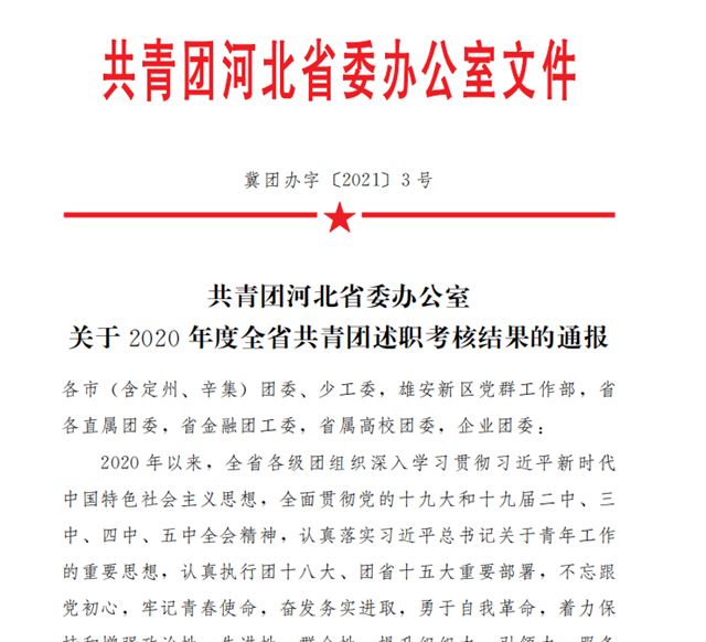 近日,共青团河北省委公布2020年度全省共青团述职考核结果,经择优评选、逐级推报、严格审核、述职考评,从邯郸市共青团“擂台赛”的激烈角逐,到团省委的“巅峰对决”,新兴铸管股份有限公司团委在50多家参赛企业团委中突出重围,被团省委授予2020年度河北省优秀企业团组织称号,这是公司团委首次获此殊荣。