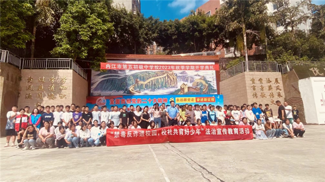 为深入贯彻禁毒反诈宣传教育从青少年抓起的理念,进一步加大校园禁毒反诈工作力度,引导广大青少年树立法治意识,识别电信诈骗套路,提升防范电信诈骗意识;正确认识毒品危害,增强识毒、防毒、拒毒能力。2023年9月14日上午,内江市东兴区联席办、东兴区禁毒办、东兴区椑木镇党委、东兴区椑木镇人民政府、联合内江市东兴区社工总站、内江市东兴区向阳社会工作服务中心特在椑木镇五初中开展禁毒反诈法治宣传“进校园”活动。