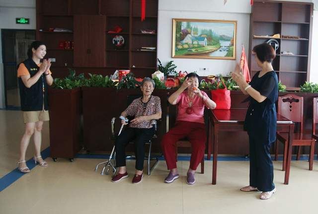 接着,越来越多的老人接过话筒,有的唱革命歌曲,有的唱地方歌曲南音片段,有的随着音乐节拍跳起舞来,就连坐在轮椅上的老人也跟着念唱、喝彩、鼓掌。整个现场,其兴勃勃,其乐融融。志愿者就忙着给老人们端茶倒水、剥粽子、递水果、搀扶走动。