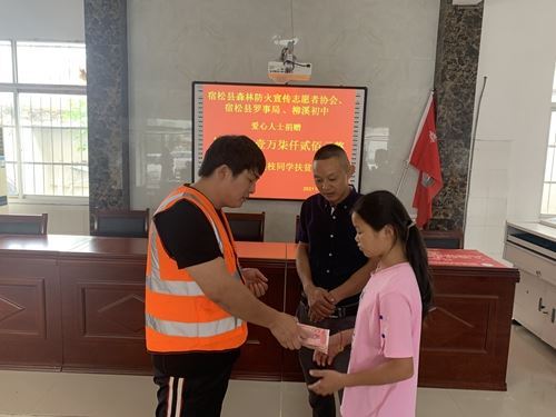 安徽宿松讯(文/图/陈达全/责编/韩同瑞)2021年7月1日,宿松县森林防火宣传志愿者协会和宿松县罗事局自媒体平台的爱心人士,冒雨来到柳溪初中,将募集到的17720元的爱心善款送到该校就读的孤儿贺奥枝手中,用于该生扶贫助学。