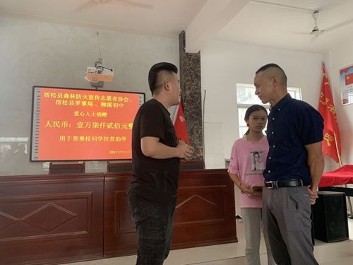 参与这次捐赠活动的有宿松县森林防火宣传志愿者协会会长石仲晖、副会长熊有才、秘书长石明,宿松县罗事局自媒体平台创始人石传奇,以及柳溪初中校长邹伟等爱心人士二十余人。捐赠仪式结束后,大家嘱咐贺奥枝同学好好学习,鼓励她早日走出困境,长大后做一个对国家和社会有用的人。