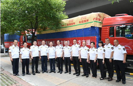 7月24日14:00,正在湖南调研的中国国际救援中心董事局康海秀主席为出征的分队授旗并作了重要讲话,他鼓励队员,不忘初心,牢记使命,有救必达。注意安全,树好形象,展现湖南应急救援队伍的良好风采。负责此次驰援任务的副总队长徐新贵庄重的接过旗帜,动情的说:“一定不负重托,保证将救援物资安全送到灾区群众手中,展示好湖南应急救援队伍的风采。”总队班子成员莫军念、戴胜宇、张金玉、浣军宇、张进谦、黄嘉杰等到现场为出征队伍践行。