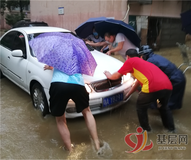 社区第一时间向街道汇报,街道工委书记潘绍辉,办事处主任厉雅硕和党政领导黄巨、欧阳文中立即赶赴现场,靠前指挥,指导社区迅速启动防汛应急工作预案,全体工作人员赶赴教师村,全力保障小区居民生命财产安全。吴栋、禹伟穿梭在楼栋间,拿起小喇叭循环提醒居民将车辆转移到安全区域;王娟、周艳武站在暴雨中,对外出的居民进行劝导疏散;万皓思、谭华嵘在小区内搬开小水道井盖,提醒行人、车辆注意安全。
