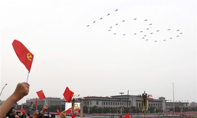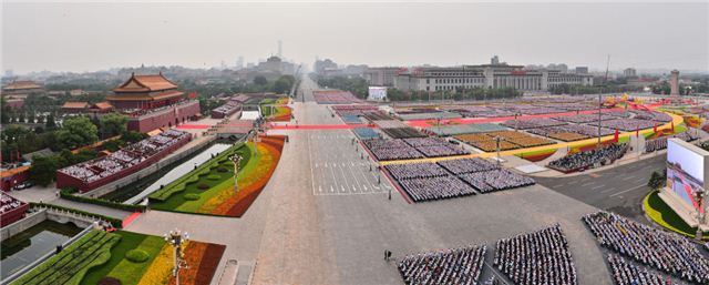 从空中俯瞰,整个天安门广场的布置被设计成一艘破浪前行的历史航船。
