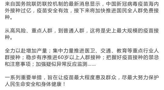 权威人士指出,通过提高人群接种率,将有效降低新冠病毒传播风险,保障人民生命安全和身体健康,为巩固经济恢复性增长基础、促进国内国际双循环提供有力保障。