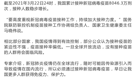 我国在新冠病毒疫苗研发和生产中取得重要进展,目前疫苗日产量从2月1日的150万剂,已提升至目前的500万剂左右,累计供应国内超过1亿剂。