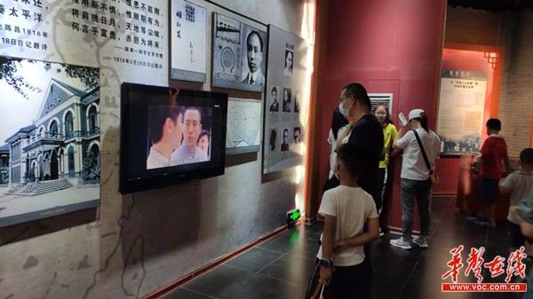 “站起来的这位是谁?”“毛泽东爷爷。”在新民学会史实陈列室内,一位年轻的妈妈手指着墙上的一幅《新民学会成立会》油画,“考问”自己的孩子;另一边,一位戴眼镜的中年人,站在《时局图》边上给儿子普及图上的“熊”“太阳”“鹰”分别有什么涵义;两位来自溁湾路小学的女生,正跟着屏幕上播放的《恰同学少年》齐声背诵:少年智则国智,少年富则国富,少年强则国强……