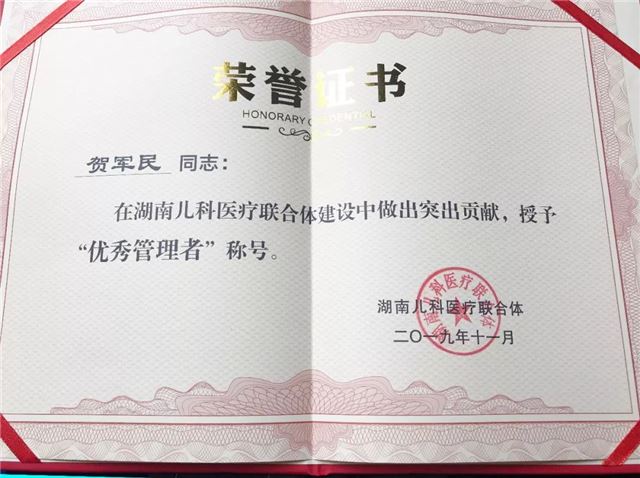 娄星区人民医院(娄星区妇幼保健院)在儿科医联体工作中取得的成绩,受到医院协会及儿科医联体的肯定,医院被评为2017——2019年度优秀成员单位,娄星区卫生健康局党组成员、医院院长贺军民因在湖南儿科医疗联合体建中做出突出贡献,荣获2017——2019年度成员单位优秀管理者称号。