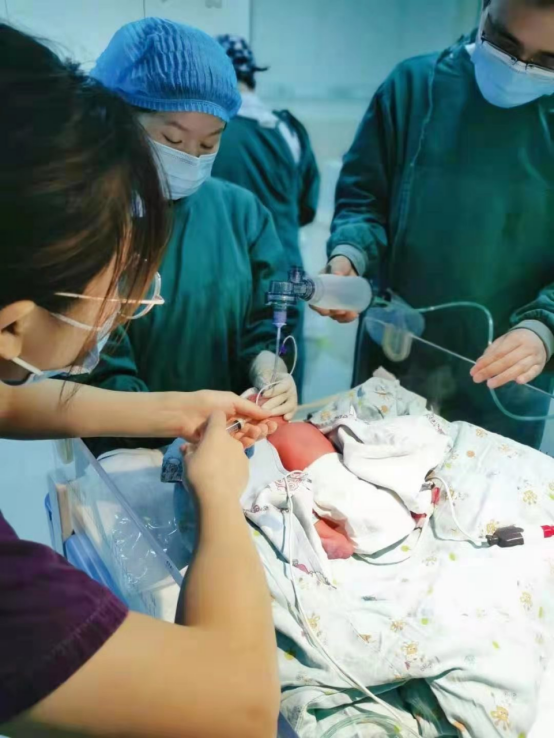 出生3小时左右,宝宝确诊为新生儿呼吸窘迫综合征。情况紧急,马上告知家属病情,在得到家属同意后,儿科团队立即对孩子进行了气管插管,使用特效药物“固尔苏”治疗。经过及时有效的抢救,宝宝的气促呻吟明显缓解,经皮氧饱和度监测恢复至90%以上。