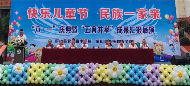 为弘扬时代主旋律,丰富师生校园文化生活,倡导高雅、健康的文化艺术生活,培养和提高学生的文化品位和艺术修养。通过校园艺术节这个窗口,展现普、特校师生奋发向上、自信自强的精神面貌,5月31日,屏山县君山路小学校和特殊教育学校共同举办了以“快乐儿童节 民族一家亲”为主题的六一庆典暨“五育并举”成果汇报展演活动。