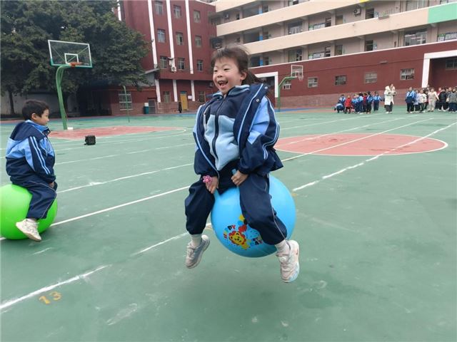 看,一二年级的小选手们骑上羊角球,双手紧紧握住球柄,眼神中满是兴奋与专注。随着一声令下,他们如灵动的小精灵般蹦跳而出。有的孩子动作灵巧,每一次跳跃都充满力量,仿佛脚下装了弹簧;有的则稍显谨慎,但也在努力保持平衡,一步一步向着目标前进。