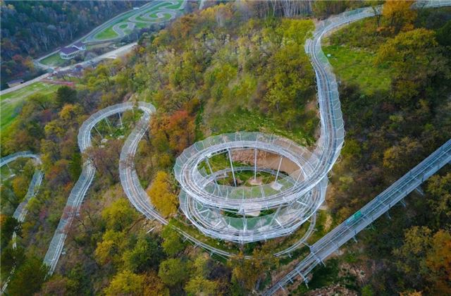 树顶漫步科普塔,全长1250米,设置有三组科普互动平台,两处玻璃景观台,各种飞禽标本,在这里,我们能够立体的看到黄龙山的植物,还能在40米的塔顶,看到黄龙山的地形地貌。