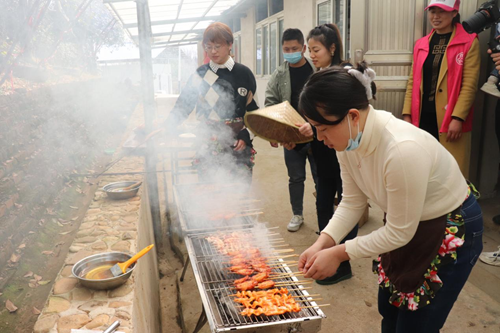 DIY花艺结束后,军嫂和孩子们纷纷体验农家生活。军嫂们带着军娃,来到树林中“寻宝”,很多军娃都是第一次体验捡鸡蛋,尤为兴奋,不一会儿大家的篮子里都装满了“白白胖胖”的土鸡蛋。在田间地头,军嫂们体验着挖野菜的乐趣,军娃们近距离感受大自然,在轻松愉快的劳动氛围中认识了许多野菜,感受了劳作的辛苦。蒿子粑粑可以说是六安人心中最喜爱的美食之一了,新鲜蒿草的清香与糯米的筋实在军嫂们的巧手中完美结合。在亲手制作做蒿子粑粑的过程中,大家不仅品尝了一道特色美食,更了解了中国传统美食文化,感受了浓浓的乡土风情。在户外烧烤中,生火、烤串、扇风、撒作料,大家分工明确、配合默契,忙得不亦乐乎。
