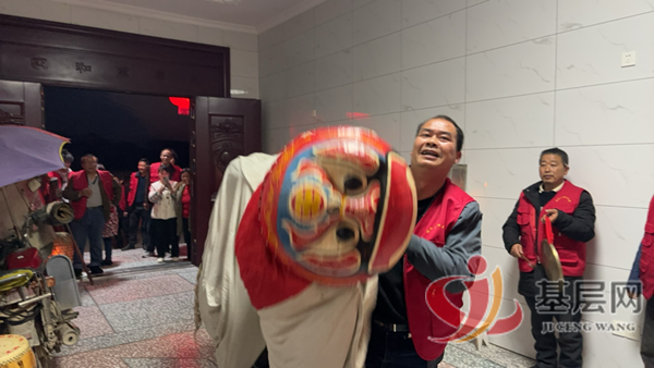 每到一户农家,满屋喜庆,人潮涌动,热闹非凡。“嗨…”,随着一声乐感悠长、洪亮悦耳的吆喝声,顿时锣鼓齐停。“一出东方红云开,云中现我土地来。土地来府无别事,玉皇赐我送财来!”伴随着狮舞锣鼓声,活灵活现的狮子昂首阔步而来。在锣鼓钹和唢呐伴奏中,展现出各式各样的动作,活力满满,博得现场一片喝彩。围观者纷纷拿出手机,记录一个个精彩瞬间。