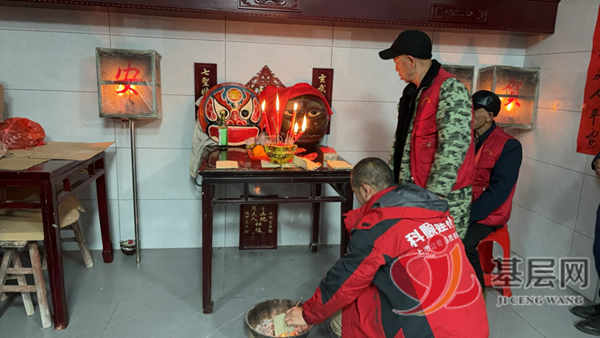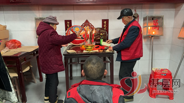 舞狮表演结束后,将狮王大圣供奉在神龛前的红漆大桌上,主家摆满贡品香茶,燃香烛,烧纸钱,接着虔诚跪拜打卦求吉,祈求新年生意兴隆,万事顺遂。“土地爷”则赞词不停,气场很酷。