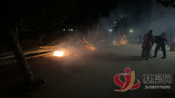 主家祈福活动结束后,将红包、烟等送到“土地爷”手中。“多承多承三多承,多承贵府赐重情。发财老板大方人,红包里面藏金银。土地是个贪财神,弯腰鞠躬谢主人。赞得真来道得灵,贵府发富万年春!”“土地”赞词令主家心悦诚服。接着,按计划、按顺序依次挨家挨户贺新春。一路上,鞭炮声、花炮声响彻云霄,云烟缭绕,似仙境一般。