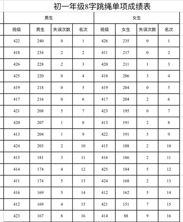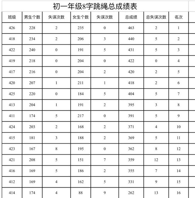 跳绳比赛 为全面落实“五育并举”教育原则,丰富同学们的课余生活,提高学生的身体素质,培养学生积极参与体育锻炼的好习惯,我校于4月28日下午开展了初一年级“8”字跳绳比赛。 本次比赛以班级为单位,每班派出24名运动员代表(包括两名摇绳队员)进行参赛,在两分钟的时间里,以跳绳中心为中心点“8”字围绕进行跳绳,成功个数越多,顺位越高。为了备战此次比赛,三个星期以来,每班都在体育课和课余时间进行着紧张而有序的练习,有的同学放弃了休息时的篮球娱乐,有的同学放弃了自我提升的课间“黄金十分钟”,甚至有班主任在体育课或课间陪着并组织同学们进行练习。阳光下,他们大汗淋漓,但脸上灿烂的笑容却洋溢着青春的朝气蓬勃。 比赛现场,每班派出的参赛选手全力以赴,表现出了不凡的实力。伴随着裁判哨声的响起,同学们轻盈地跃过跳绳,长绳飞舞之下愈战愈勇、越跳越快,耳畔只留下呼呼的风声,围观的同学也禁不住为选手们加油鼓劲。每名参赛选手都表现出了志在必得的信心,此时的校园内呈现一片健康阳光、运动向上的景象,只见一根根彩绳飞舞,一个个纯真的笑脸在灿烂的阳光下闪烁着光芒。 激情与紧张同在,友谊与竞争共存。此次跳绳比赛使同学们增强了体质,愉悦了身心,同时展现了同学们敢于拼搏的精神风貌和团结协作意识,促进了我校学生素质的全面发展和提高。
