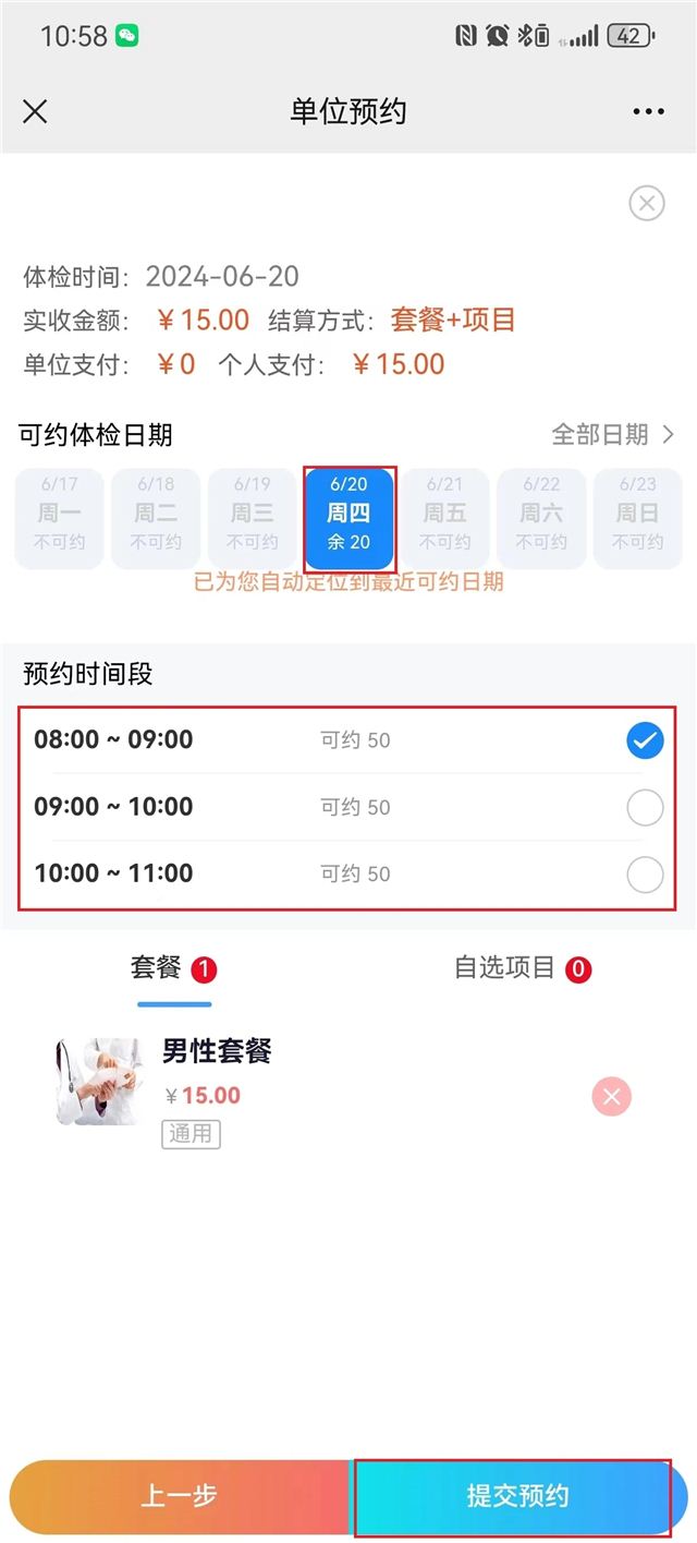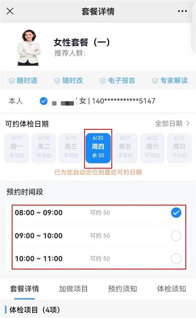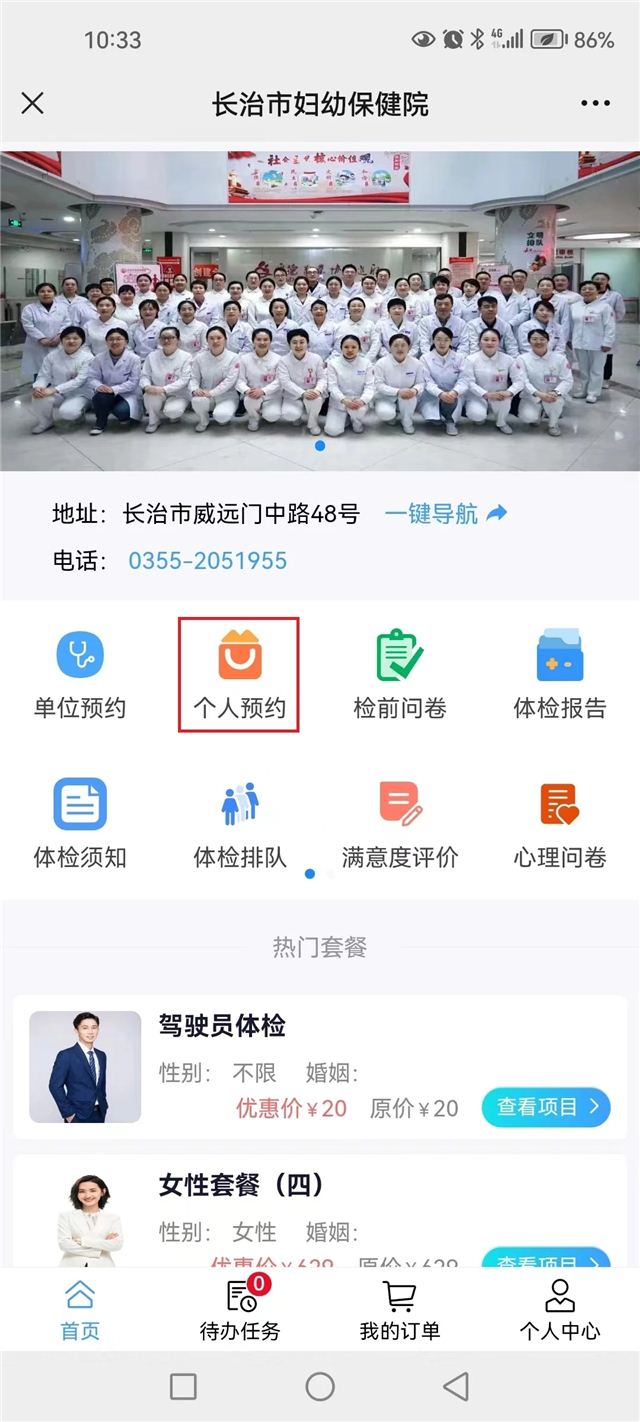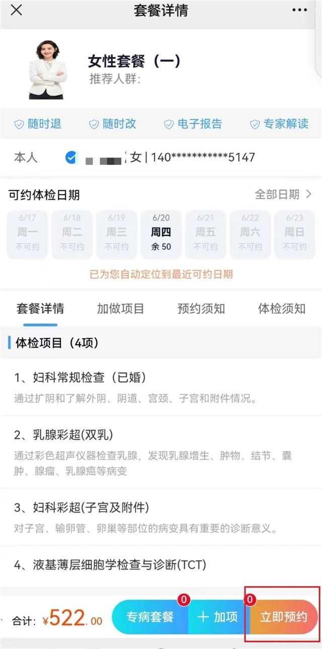 ①点击“个人预约”,选择体检套餐,确定体检时间,点击“立即预约”,预约成功。