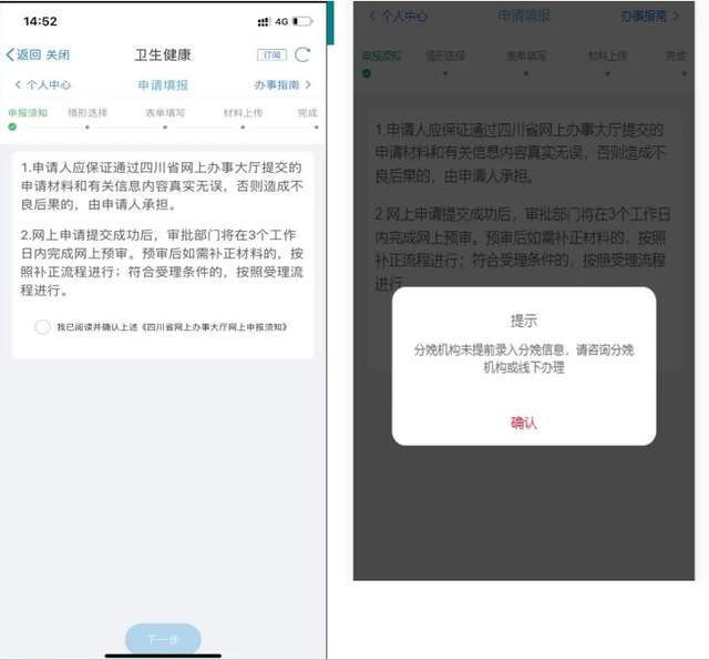 2.阅知“申报须知”内容后,选择“我已阅读”按钮,点击“下一步”进入情形选择。当提示“分娩机构未提前录入分娩信息,请咨询分娩机构或线下办理” 时,说明申请人(婴儿母亲本人)信息未录入“四川直报系统” ,需先录入再进行申请。