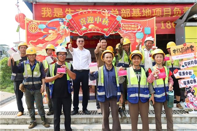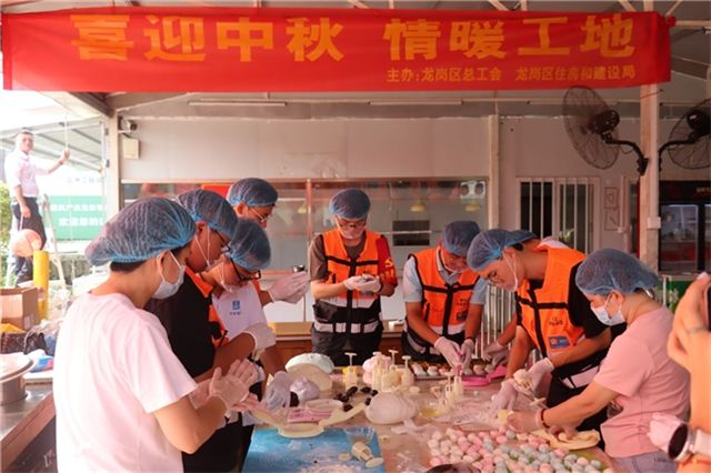 9月12日,由龙岗区总工会、龙岗区住建局联合举办的“喜迎中秋 情暖工地”关爱活动走进中建八局南方公司深圳生态智谷建筑产业总部基地项目工友村。活动组织糕点师傅指导工程建设者进行月饼DIY,邀请广大工友化身主人翁,共同参与工友村“家氛围”营造,为300余名工友送上节日慰问与祝福。