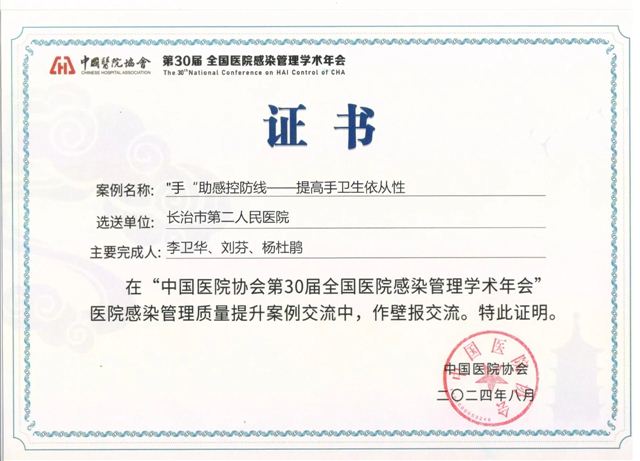 近日,在中国医院协会医院感染管理学术年会中,长治二院医院感染管理科的《提升择期手术患者术前皮肤准备合格率》进行大会交流,并荣获攀登案例奖。
