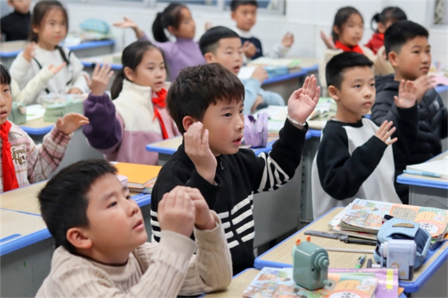 “红星闪闪放光彩,红星灿灿暖胸怀。红星是咱工农的心,党的光辉照万代……”学府小学三年四班的教室里传出一阵阵响亮的歌声,走近一看,小学生们脸上洋溢着笑容,手上还做着手势。原来是浙江工商大学杭州商学院会计学院的志愿者们在教小朋友们做《红星闪闪》手势舞。