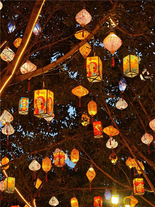 1月30日晚,小编在壕子口街道内棉片区的圣江路看到,一场绚烂夺目的光影盛宴正在上演。道路入口处,灯光巧妙勾勒出树木形态,形成一条璀璨的“灯光隧道”,树冠间悬挂的特色“国潮宫灯”与树干上点缀的动态发光蝴蝶相映成趣,让游客步入街区便眼前一亮。