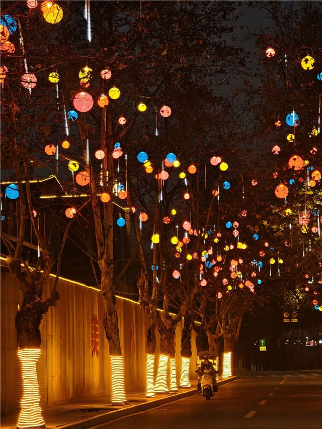 沿圣江路前行,行道树被暖色灯带缠绕,树冠上装饰着缤纷的“艺术彩色球”与模拟“动态流星雨”的灯饰,光影流转间,为夜市增添灵动与浪漫。