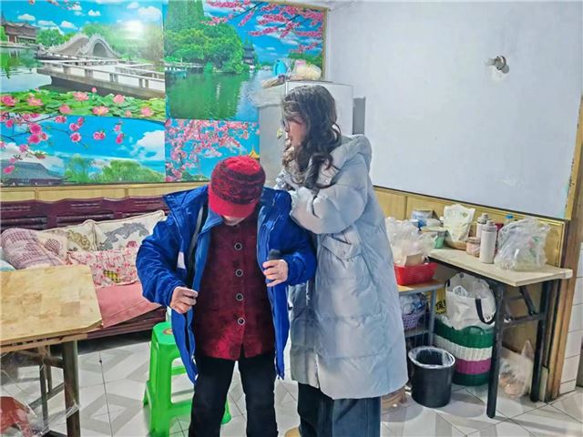 社区工作人员小倪和网格员小郭提着冲锋衣来到低保困难老人罗奶奶家。一进门,小倪便蹲下身帮老人试穿,边整理衣领边询问:“罗奶奶,您看这深蓝色的冲锋衣喜欢吗?里面加了厚绒,拉链拉到顶能护住脖子,刮风下雨都不怕。”罗奶奶摸着衣服,笑得眼角泛起皱纹:“喜欢!这衣服厚实,穿上肯定暖和!”小郭接过话:“罗奶奶,临近春节,祝您及家人新春快乐、身体健康!”罗奶奶连连点头,拉着两人的手感激地说道:“你们总惦记着我,比我亲孙女还要贴心几分!”