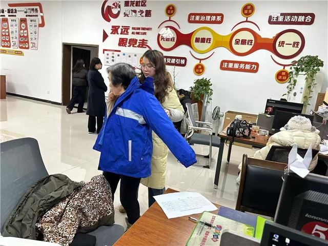 对能自行外出的老人,社区则安排集中领取。75岁的唐婆婆来到社区便民服务站,工作人员小倪帮她穿上深蓝色冲锋衣,并细心调整袖口:“唐婆婆,这衣服是两件式的,天热的时候可以脱掉一件。”唐婆婆试了试,满意地说:“社区想得真周到,这衣服既好看也保暖,还有你们的关心,都暖到我心里了!”