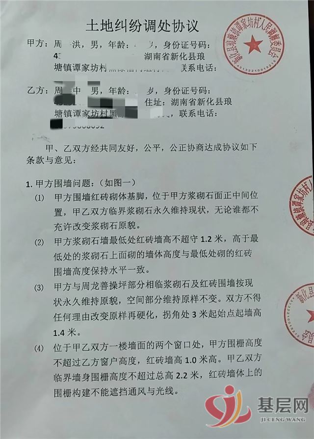 三年前,周某洪与周某中两家的新房相继落成,却在界限划分上产生分歧。原本签订的调解协议因一方反悔沦为废纸,地基越线、排水纠纷、道路占用等问题层层叠加。