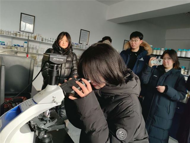 图为实践团在实验员带领下观察药剂微观结构。杜枫 供图