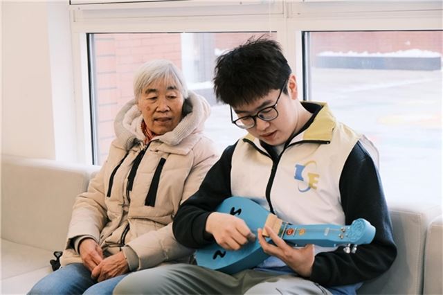 ▲图为实践队员用尤克里里为社区老人弹唱,送去冬日里的温暖陪伴。