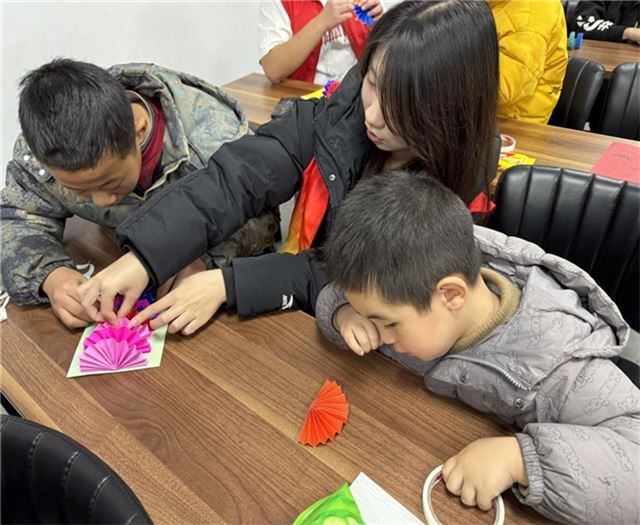 手工灯笼制作环节让年味在指尖流淌。志愿者提前筹备环保安全材料,设计传统宫灯、卡通生肖灯等多种样式,分组手把手指导孩子们完成搭建、裁剪、装饰等步骤。制作过程中,志愿者讲解灯笼文化寓意与春节挂灯笼习俗,大家分工协作、其乐融融。百余盏色彩鲜艳的手工灯笼相继完工,成为承载新年期盼、联结师生与社区温情的纽带。