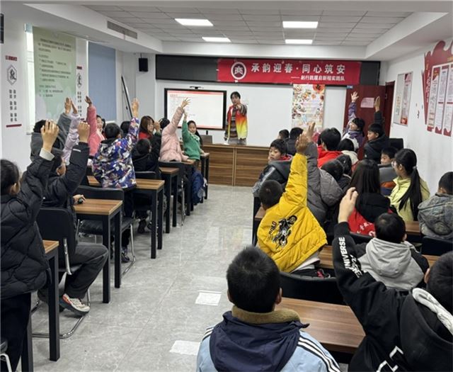 知识问答环节将氛围推向高潮。每一道题目都涵盖文化或安全知识并分必答、抢答、风险三个环节,难度梯度适配不同年龄段参与者。孩子踊跃互动,老师轻声提示、孩子争相抢答,掌声与欢呼声不断。志愿者为答题成功者送上手写春联、安全知识绘本等礼品,同时耐心解答疑问,手把手教老年人防范网络诈骗,让互动成为巩固知识、深化交流的重要载体。