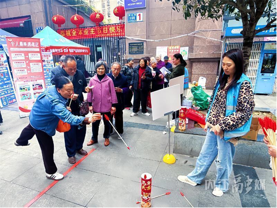 “欢迎您来到第一关:趣味问答,请听题——火警电话是什么?”“119!”“回答正确,恭喜您获得一枚印章!”活动现场,趣味问答关卡前人气十足,主持人的提问刚落,居民们便踊跃抢答,清脆的应答声与阵阵掌声交织在一起,热闹非凡。本次活动以闯关形式展开,设置了趣味问答、投壶问礼、健康深呼吸、传统捶丸、时来运转五个特色关卡,居民需依次完成各关卡挑战,集齐5枚印章后,即可获得5次欢乐套圈机会,赢取鸡蛋、蔬菜、饮料、纸巾等奖品。