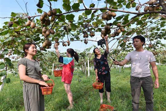 游客在猕猴桃基地体验采果购买