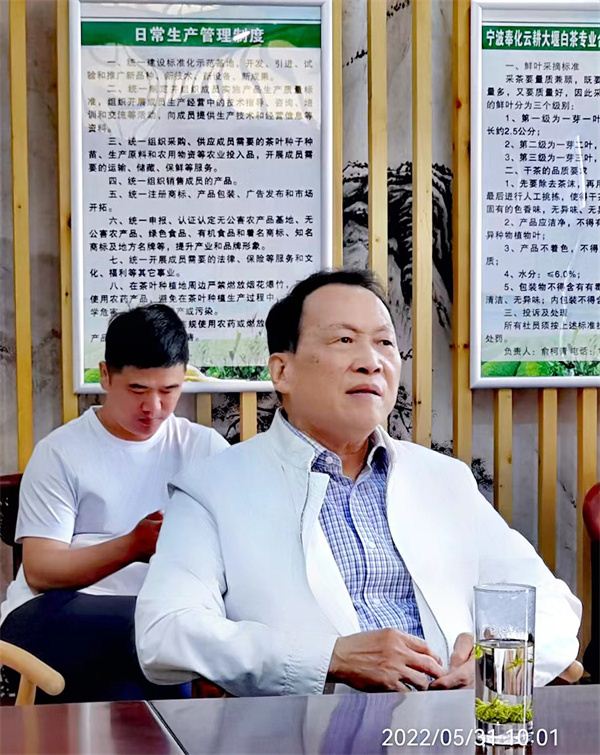 2002年,大堰镇“人才引进”了新昌制茶高手俞柯青,当年他承包了200多亩生态茶山,以“大堰生态白茶”为主,投资了800余万元,成立了奉化大堰茶场,带动大堰镇300余户茶农共同富裕。2022年1月18日,以俞柯青为法人代表兼任理事长的“宁波奉化云耕大堰白茶专业合作社”登记成立,有核心社员14人,涵盖董家岙等6个村种茶大户,另引入已确定使用镇级通用包装的一般社员近百人,已村域为单位,形成社长、核心社员和一般社员的组织框架,以便合作社加强管理。