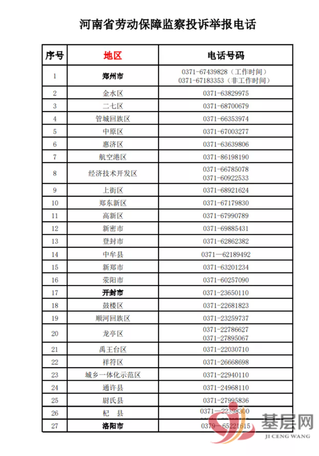 为进一步畅通投诉举报渠道,推进根治欠薪冬季专项行动深入开展,方便广大劳动者及时维权,省人力资源社会保障厅再次向社会公布全省劳动保障监察投诉举报电话。劳动者可以拨打电话咨询政策,反映问题,投诉举报,也可登录河南省农民工工资支付监管系统反映欠薪问题。