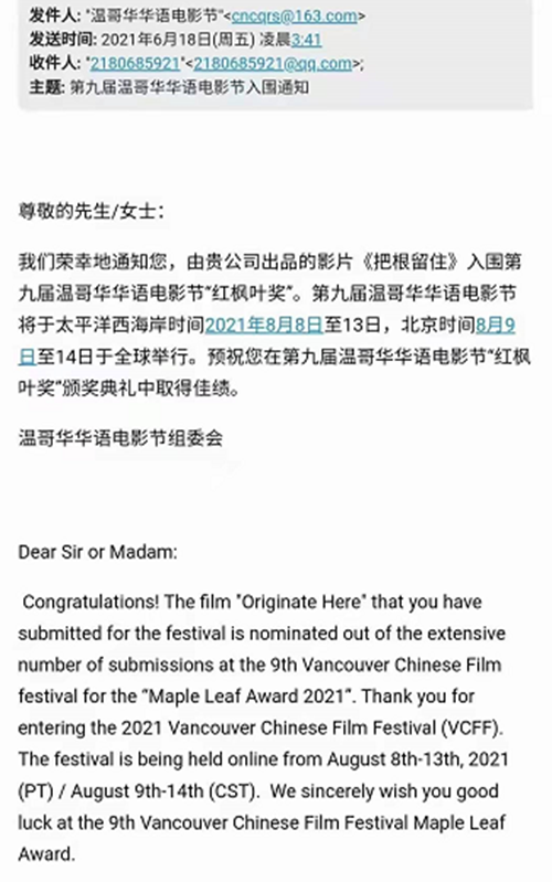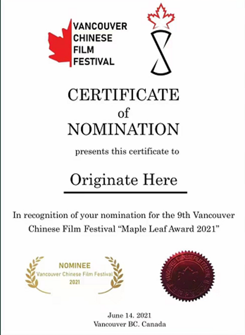 据悉,今年6月,本片从世界各国及港、澳、台地区的华语电影1899部作品中成功入围加拿大第九届温哥华华语电影节“红枫叶奖”主竞赛单元,8月13日,从70部入围作品中脱颖而出入选大赛10部展映影片,并荣获展映优秀影片、最佳剪辑两项大奖。