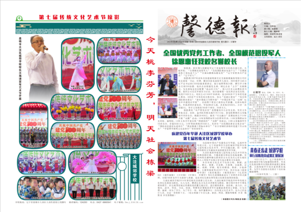 大洼区城郊学校《馨德报》每月一期,全彩4个版面,铜版纸印刷,版面栏目设置为头条新闻、今日头条、教海精英、学生天地、学生才艺等,逢学校传统文化节、军事展演、运动会等特殊活动会出版专刊专版相配合,《馨德报》每期报头都邀请国内著名书画家题写,稿件编排采取正规新闻媒体采编流程,图片拍摄、编辑要求尽量精美,符合传播和新闻主题,让一张小小的校报起到大作用。