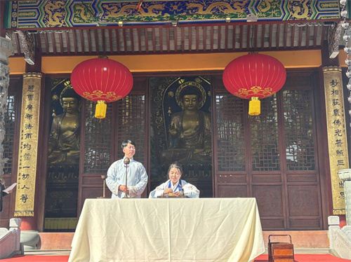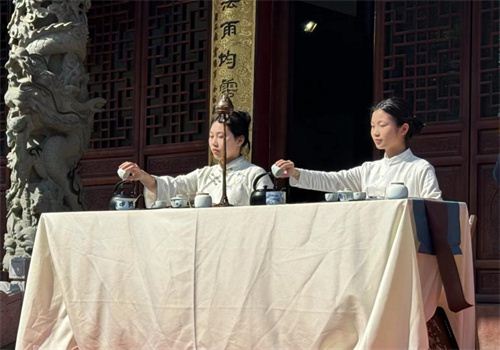 宁波市潘君耀技能大师工作室弟子陈青竹(左)、李梦阳(右)演示内家茶道