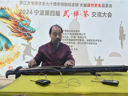 有茶岂可无琴?诗人、古琴家屠一宝凝神奏《普庵咒》一曲。古琴曲《普庵咒》,又名《普安咒》或《释谈章》,最早见于明末的《三教同声》琴谱(公元1592)。全曲分:佛头、起咒、第一回、第二回、第三回、佛尾六部分。曲调雅畅清逸,质朴平实,颇有庄严肃穆之感。屠一宝先生,笔名呆子,号缘督禅师、口木了一,甬上望族屠氏第二十二世孙,浙江省宁波市教育局教研室英语教研员,出版有《缘督诗心》中英文诗集,《屠一宝语三百首》,古琴师承国家非物质文化金陵派代表性传承人桂世民先,并得多名琴家指导、博采众长。