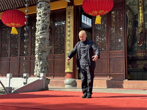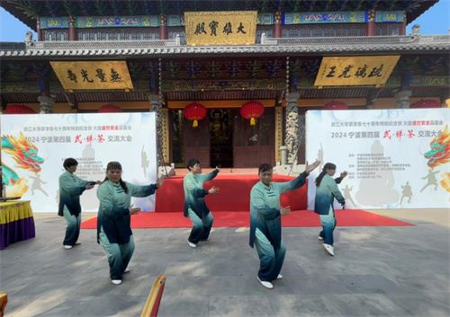 大会第三个节目为观音拳,由蛟龙太极队虞亚芬、崔银杏、孙意琴、虞海玲等表演。观音拳又称太极养生观音拳,是佛拳中的一种,其拳谱出自浙江天台护国寺善觉法师,由江慧丽老师创编,融合了陈氏太极拳、瑜伽、佛手印等多家法门。表演者身着练功法,于大殿前演练拳法,表情庄严,拳势优雅。