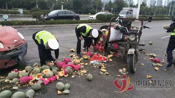 (中国基层网10月16日消息 通讯员 张聪聪 鲍玉冰 郗艳)10月14日早上07:10分许,济宁北湖交警大队民警郭瑶迪巡逻至京杭路与荷花路交叉口时,见一辆满载哈蜜瓜的三轮车左转弯时车速过快与由西向东行驶的汽车相撞,哈蜜瓜散满地.郭瑶迪立即通过对讲机向北湖调度室及特勤中队队长谢勇汇报.副大队长曹修建、车寅启接到报警后立即组织民警李君、朱贞东、李树鹏火速赶往事故现场处置。