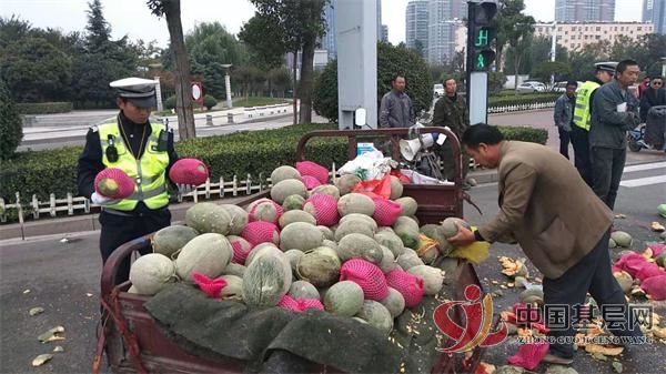 三轮车上所拉的哈蜜瓜随处散落,占据了行车道和部分斑马线,还有大量附近闻讯赶来围观的群众,见此情形,民警迅速行动起来:一方面安排警力在事故地点后方设置安全锥桶,引导后方车流避让,保障事故现场交通秩序的安全畅通;另一方面在查清事故原因并处理后,迅速安排出警人员帮助车主着手捡拾散落的哈蜜瓜,最大程度地为当事人挽回经济损失,力争在最短的时间内恢复交通。