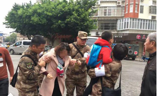 送孩子上学途中,一场突如其来的车祸,让来自惠安的何女士倒在地上血流不止。关键时刻,身着迷彩服、别着红十字白色臂带的12名来自联勤保障部队第910医院野战医疗队的队员恰好路过,他们立即下车施予援手,让惊魂未定的母子二人暖心不已。