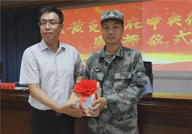 8月20日上午,《黄克诚在中央纪委》赠书仪式在陆军第八十集团军某合成旅举办。国防大学第二编研室原主任、《黄克诚传》编委会办公室主任马长志,《黄克诚在中央纪委》作者、湖南新宁籍作家王子君,人民出版社图典分社社长侯俊智,旅长耿大勇、副政委刘信磊等参加活动,赠书仪式由刘信磊主持。